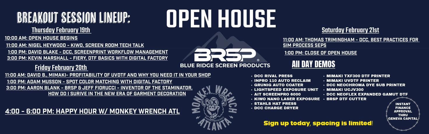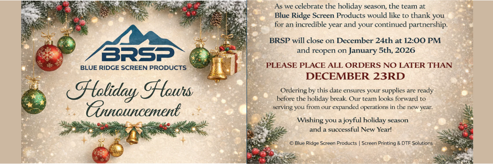 Blue Ridge Screen Products carries the very best textile printing supplies and equipment to help you run a successful print shop. We work with leading manufacturers in the industry to custom-tailor solutions to fit our customer’s needs. Contact us and find out what we can do to help you improve your printing game.