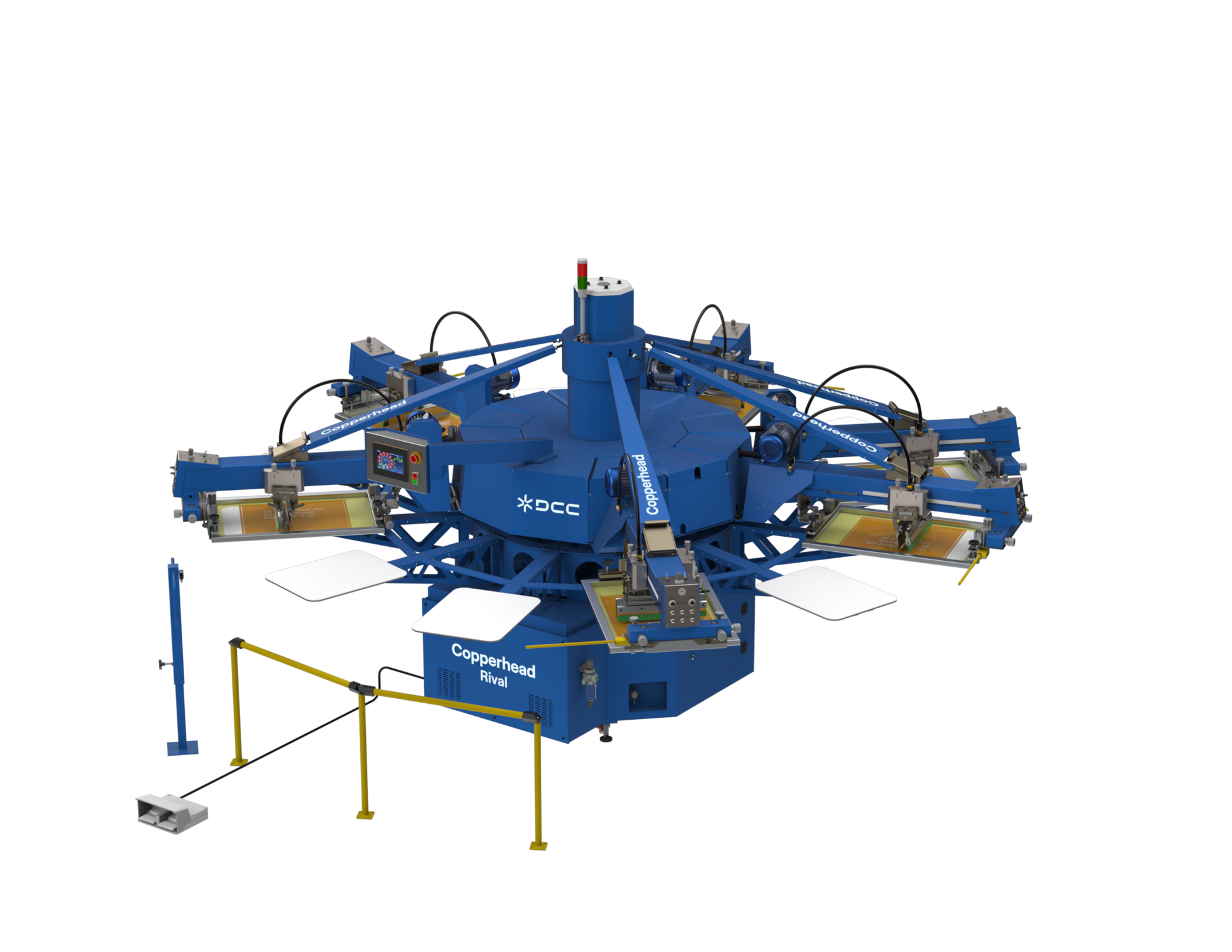 The DCC Copperhead Rival is a versatile, high-performance automatic screen printing press designed for mid- to high-volume production environments. Built with durable construction and smart automation features, the Rival provides consistent, repeatable output and operation that helps screen print shops increase efficiency while reducing setup and operator dependency.
